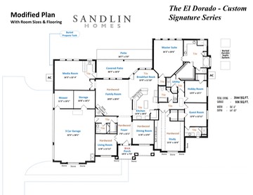 This is our floorplan showing the room sizes and where there is tile and nailed down hardwood flooring.