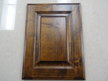 The cabinets are Antique Brown stained Knotty Alderwood custom built by Bailey Cabinets. The upper kitchen cabinets will have an Arc instead of a straight line for the beveled area near the top. These cabinets will be in: