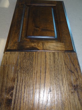 - Antique Brown stain and Knotty Alderwood doors on the 16 linear foot, floor to 10’ ceiling bookcase.
